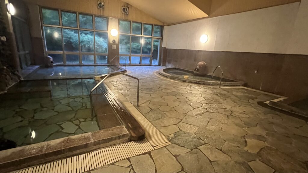 内湯は、3つの浴槽があり、熱すぎずぬる過ぎずのどれも同じような温度。どこに入っても変わらないので空いてる浴槽をチョイス。浴槽の床がでこぼこざらざら系でお尻がちょっと痛い。かすかに塩素臭のするお湯は、ぬるすべ感はなく、泡付きもなし。しっかりと芯まで温まる。pHは9.6と高め。