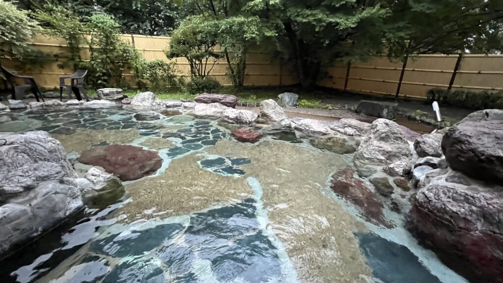 露天風呂は広めだが、浴槽は浅い。目隠しにより眺望はなし。内湯に比べややぬるめ。