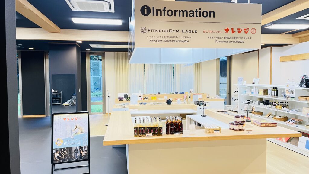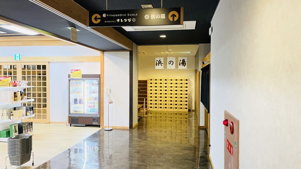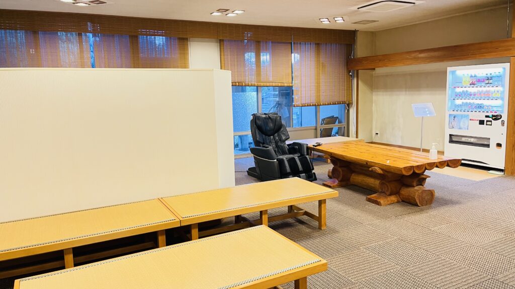 休憩所は、ちょっとしたベンチみたいな畳。アイスの自販機はなし。1台だけ無料のマッサージ機がある。