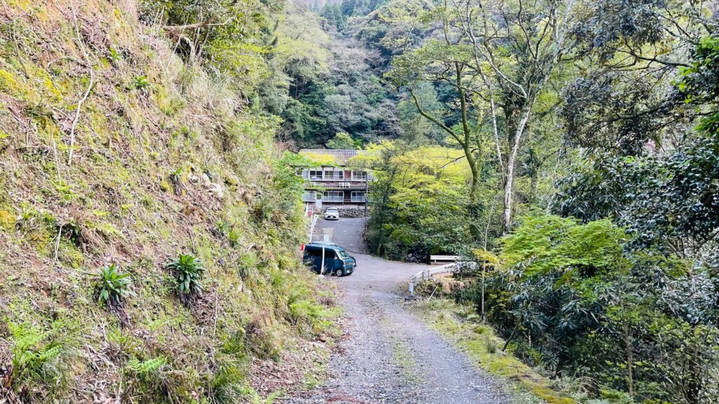 アクセスは、見通しが悪くすれ違い困難な道を進む。はじめのうちはすれ違い用スペースが点々とあるが、施設手前1Kmほどは、すれ違い用スペースがないので、安全運転に譲り合いで。駐車場も狭く、施設前に舗装された第1駐車場があるが、4~5台分。未舗装の急なでこぼこ道を登って、第2、第3駐車場がある。第1駐車場は落石があるらしく、第2駐車場に停めるのが無難とのこと。