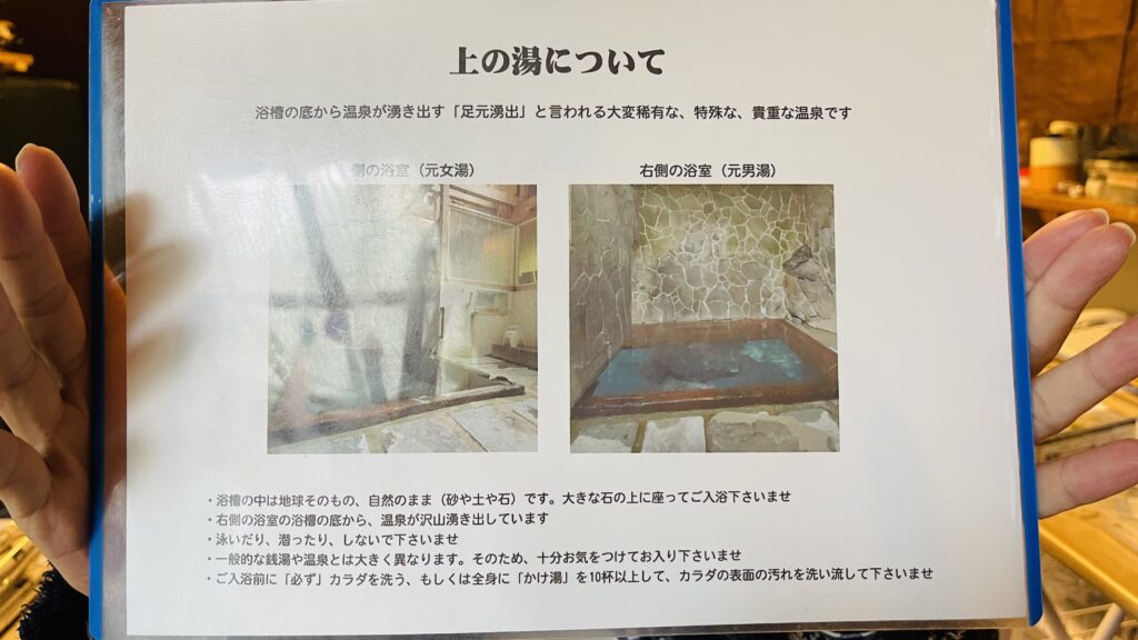 入り方や浴室の構造は、『上の湯』と『下の湯』で異なる。はじめに受付時に説明してもらえる。大切な自然のお湯、マナーを守って気持ちよく入ろう