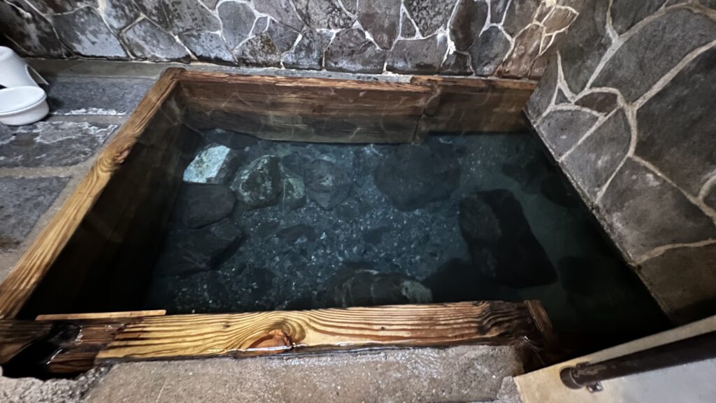 狭くはないが、お湯が湧出する底に足をつけると砂が舞ってしまうので、すのこの上に入る。そのため、入れる人数には限りがあり、混んでいると足を伸ばしてのんびり入ることが難しい。土日、連休は混みあうようなので、平日の夕方あたりの空いている時間帯がベスト